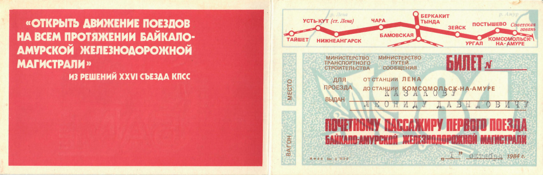 Билет почётному пассажиру первого поезда БАМа