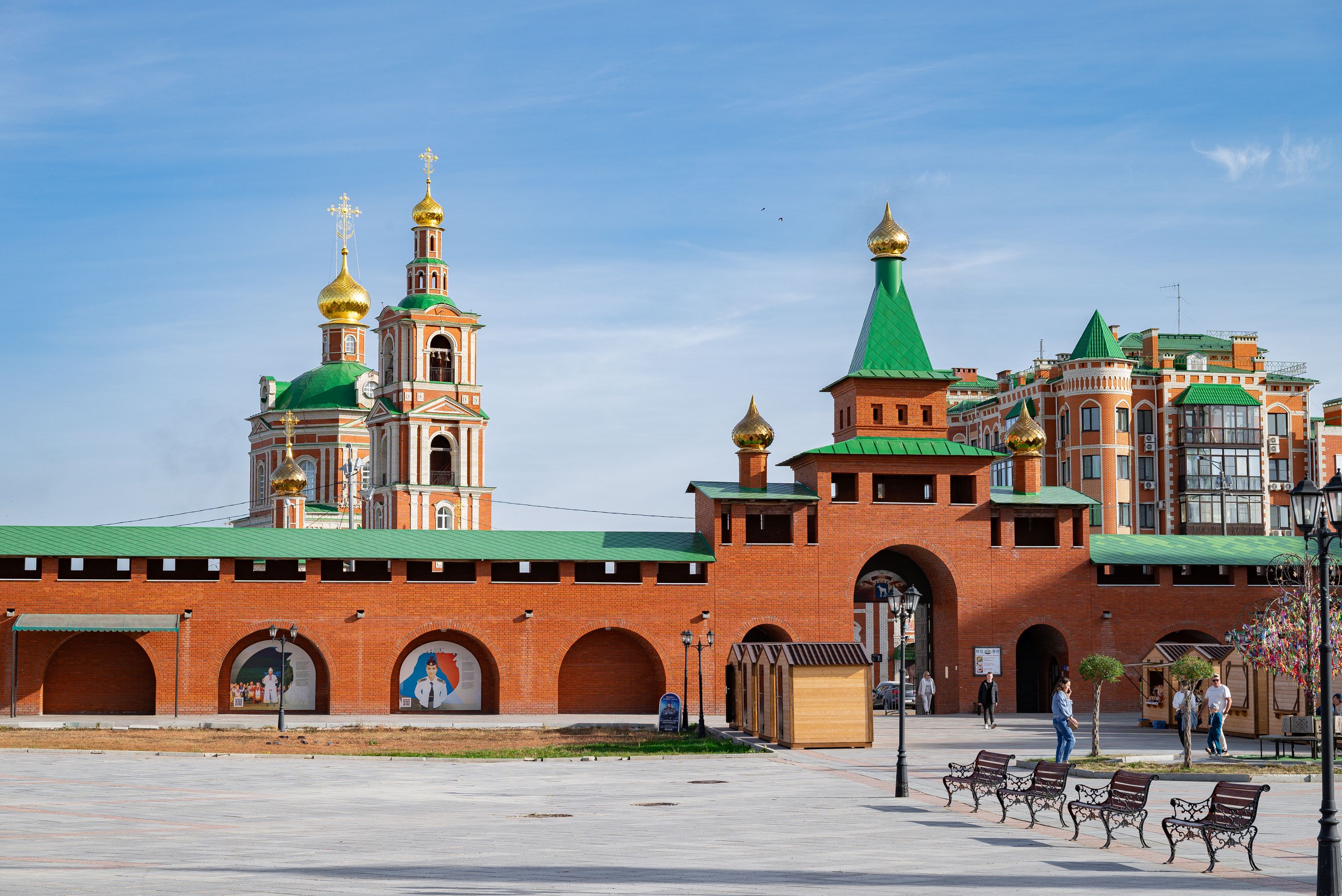 В XIX веке на этом месте располагалась Базарная площадь, а в советское время — площадь Революции. Кремль выстроен из кирпича по образцу памятников средневекового русского зодчества и в плане представляет почти квадрат. Это замкнутый комплекс из четырех башен, объединенных стенами с проходными галереями. Угловые башни, три квадратные и одна круглая, завершены шатровыми покрытиями. На восточном, южном и западном прясле стены устроены крепостные ворота. Вместе с реконструированными в 2000-е храмами, набережной реки Кокшаги кремль символизирует военно-оборонительные крепости старинных русских городов.