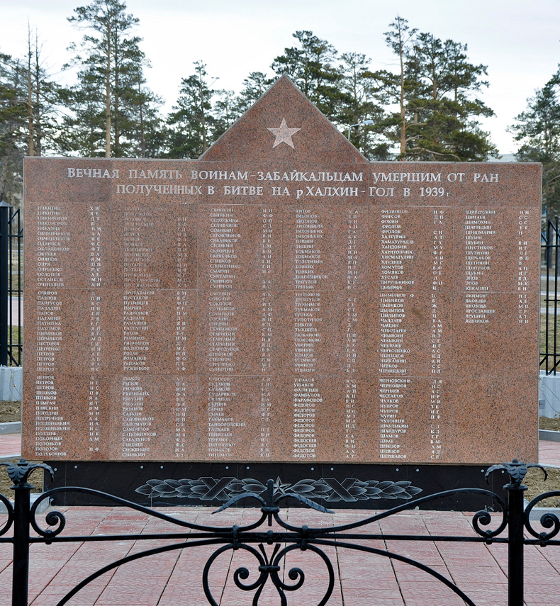 В 1989 году в Чите на братской могиле 25 воинов, погибших на Халхин-Голе и умерших от ран в госпиталях города, на Старочитинском кладбище был установлен памятник.