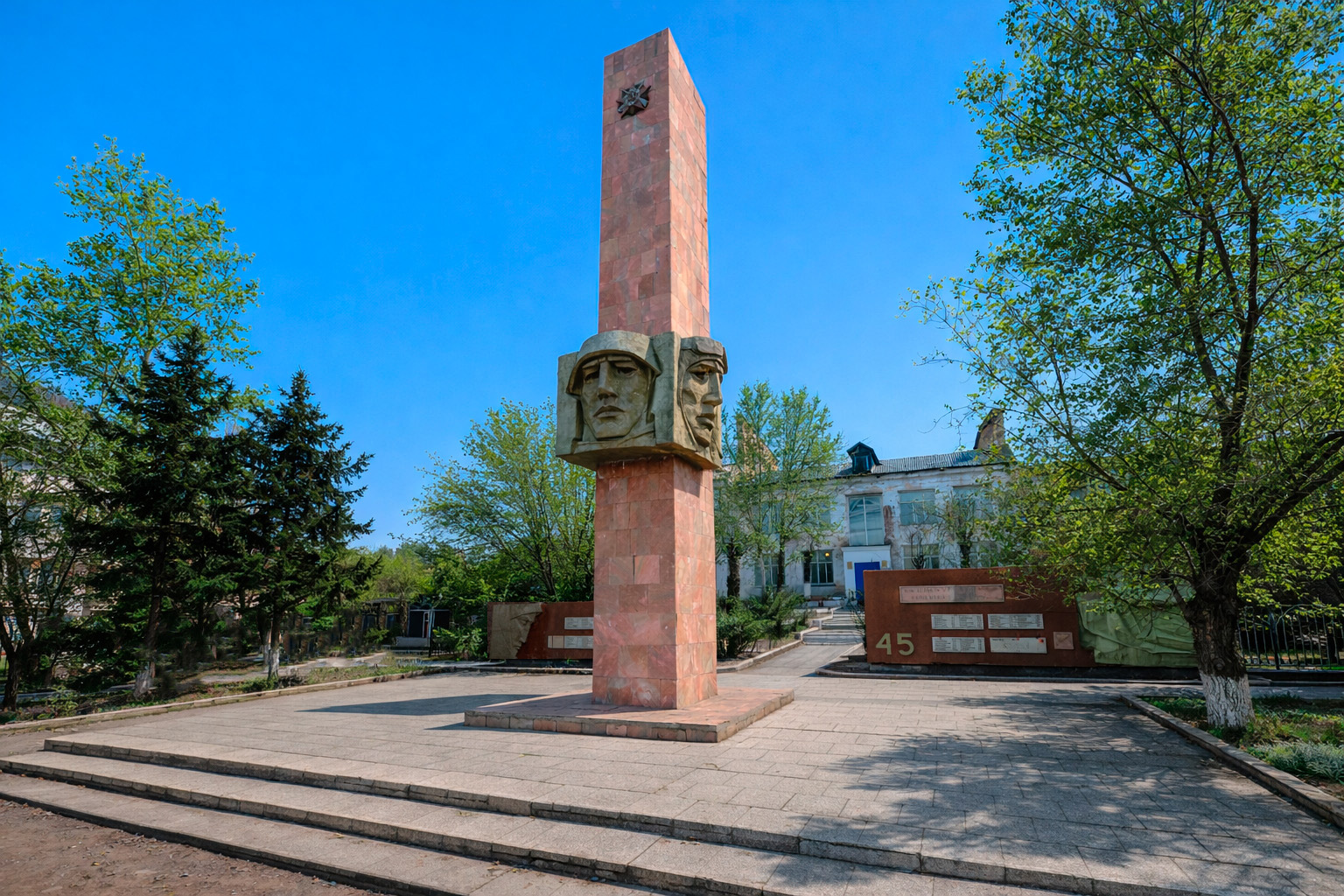 Памятник представляет собой бетонную стелу, по трём сторонам которой размещены лица трёх солдат — представителей морских, сухопутных и воздушных войск Красной армии.