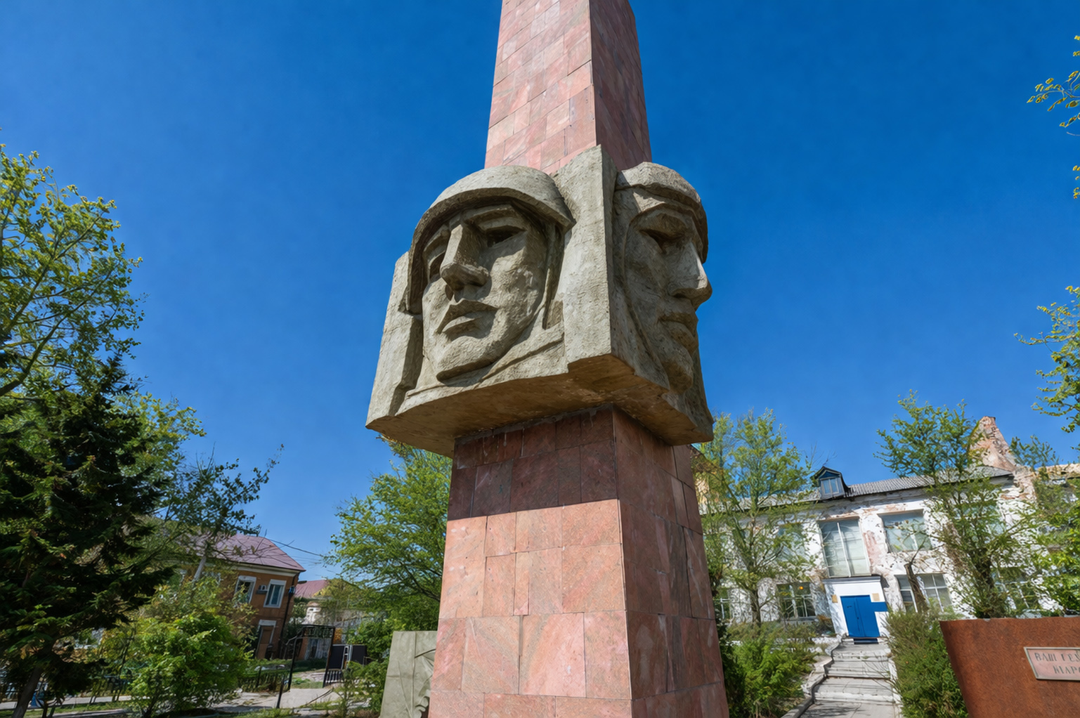 На головах солдат — бескозырка моряка, шлем пехотинца и очки пилота. Вверху стелы установлено скульптурное изображение ордена Отечественной войны.