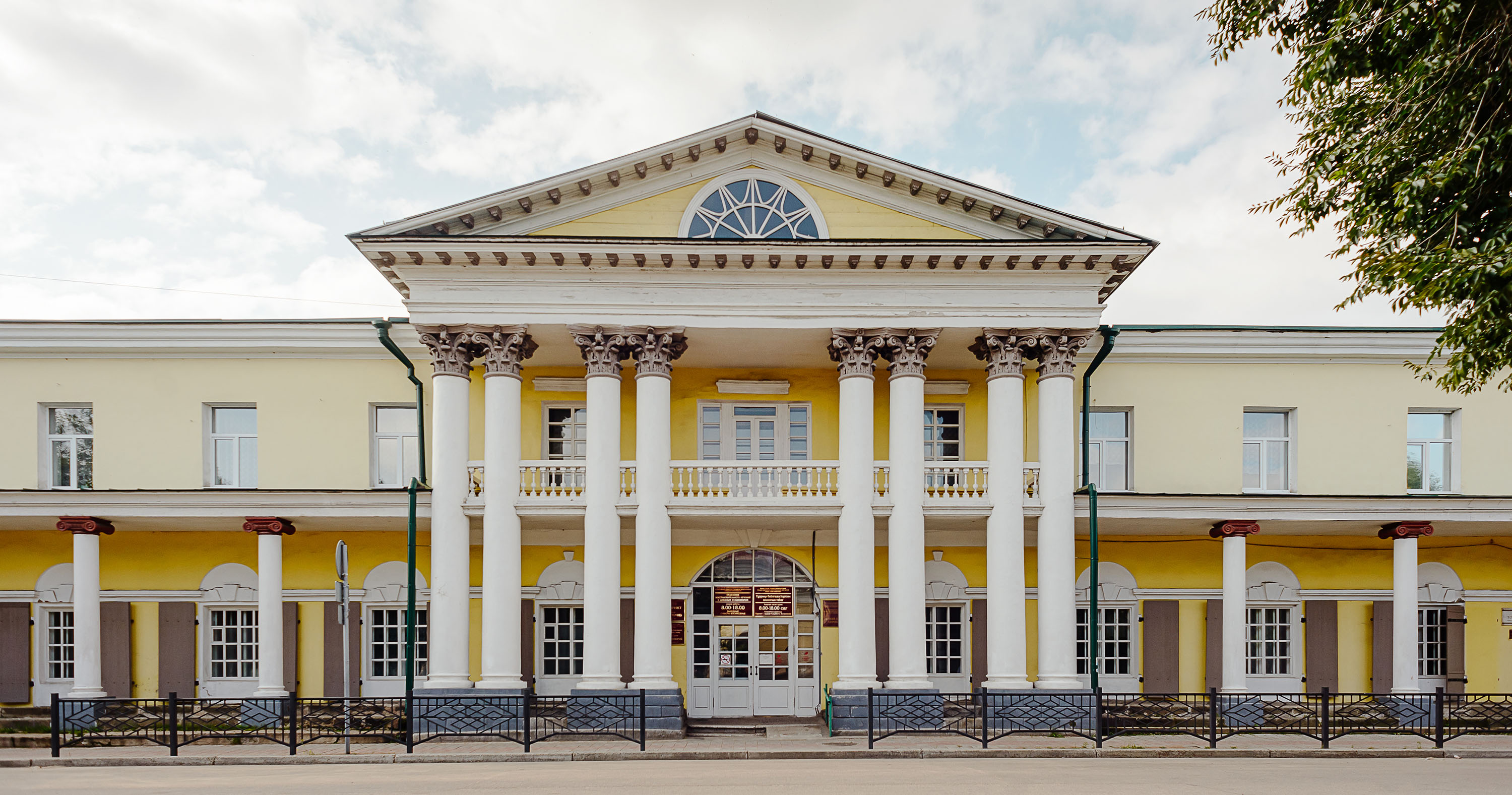 Всего внаём сдавалось 16 лавок. Вдоль торговых помещений проходит живописная крытая галерея. Её своды поддерживаются колоннами в ионическом стиле, сделанными из цельных лиственниц. То, что сегодня мы принимаем за вход в здание, на самом деле было арочным проёмом — въездом во двор.