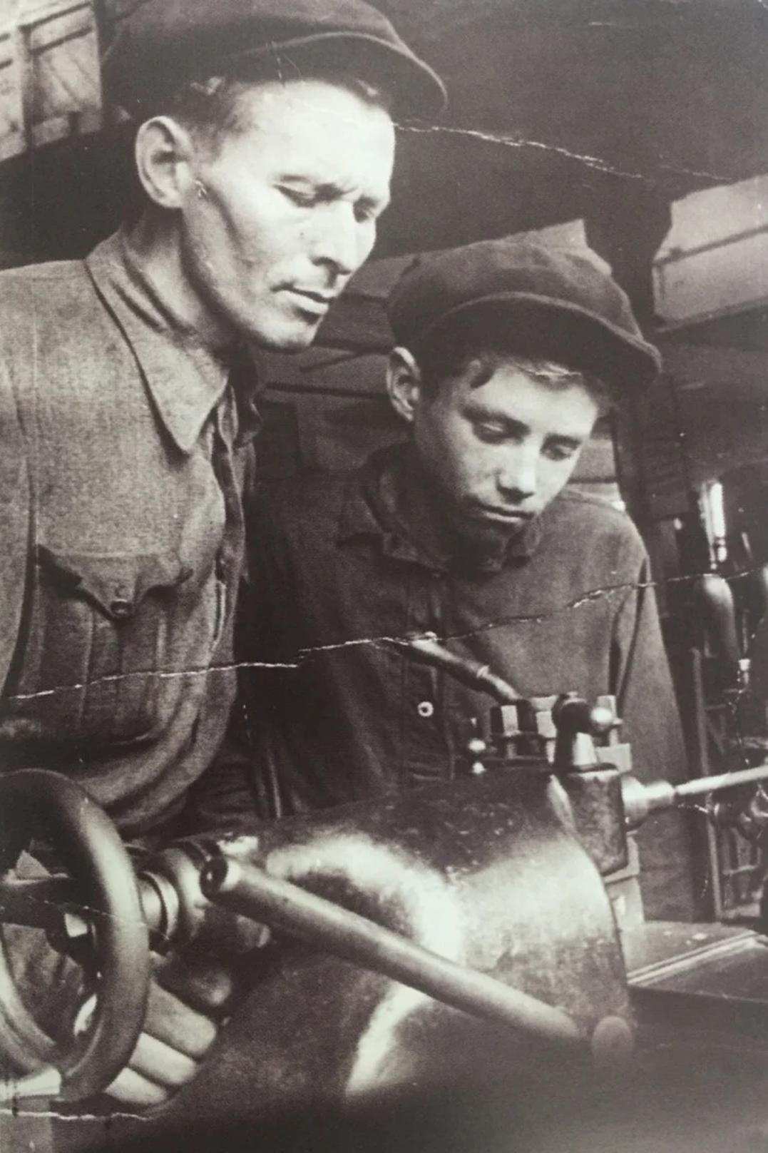 Б.З. Поздеев, наставник молодёжи, с учеником Менделеевым, 1943г. Паровозоремонтный завод. Фотография из фонда Музея Истории Улан-Удэ